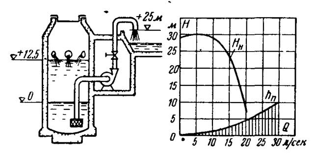 Для откачки воды из дренажного колодца с притоком от Q = 5 л/с до Q = 30 л/с установлены центробежные насосы, характеристика каждого из которых задана. Насосы имеют общую всасывающую и нагнетательные линии, кривая суммарных потерь для которых указана на графике.