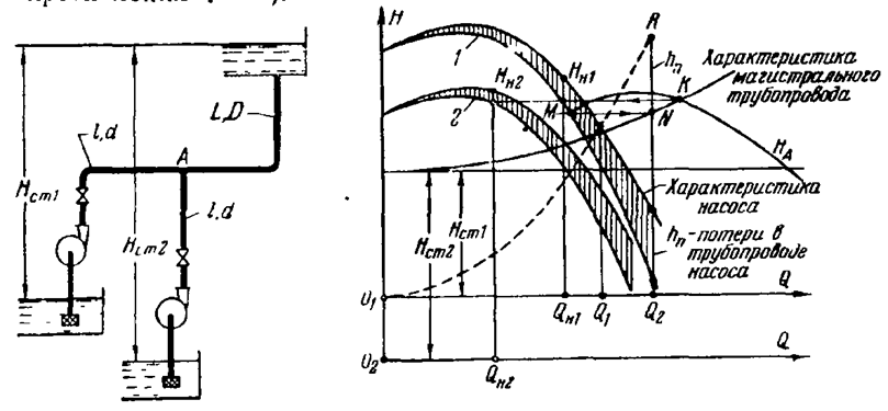 Два одинаковых центробежных насоса работают совместно на магистральный трубопровод длиной l=1000 м, диаметром D = 450 мм при различных значениях статического напора: Hст1=20 м и HСт2 = 30 м. Трубопроводы насосов (смыкающиеся в узле А) имеют одинаковые длины l=100 м и одинаковые диаметры d = 300 мм. Определить:
