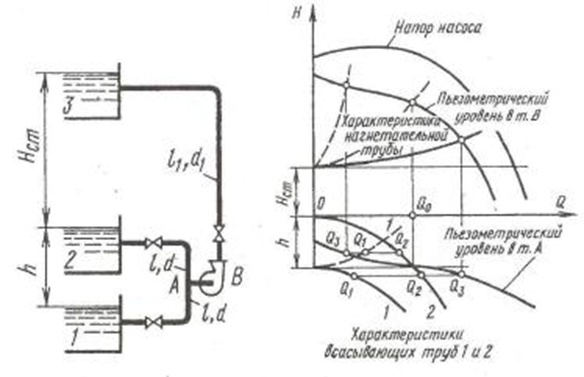 Указание. Из характеристики насоса, построенной от уровня воды в баке 2, следует вычесть суммарную характеристику совместно работающих всасывающих труб, которая дает зависимость пьезометрического уровня в узловой точке А перед насосом от суммарного расхода в этих трубах (т. е. подачи насоса). В результате вычитания получается кривая зависимости пьезометрического уровня в точке В на выходе из насоса от его подачи. Пересечение этой кривой с характеристикой нагнетательного трубопровода, построенной от уровня бака 3, определяет рабочую точку системы. При подаче насоса, равной Q0 (см. график к решению задачи), расход из бака 1 равен нулю.