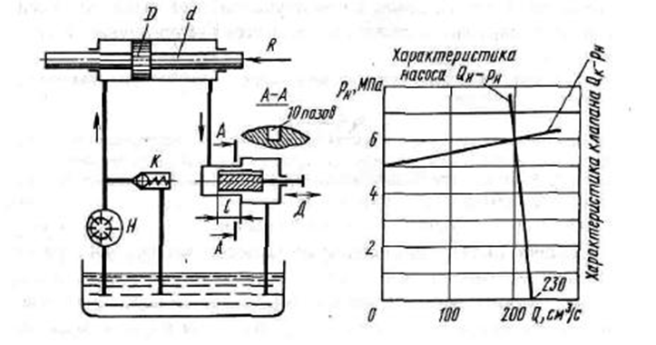 Задача 14.47. Шиберный насос Н подает жидкость (минеральное масло, плотность р = 900 кг/м3, вязкость 0,09 П в гидроцилиндр с диаметрами: поршня D= 60 мм и штока d = 30мм. Характеристика насоса задана в виде зависимости между подачей Qн и развиваемым насосом давлением Рн, Насос снабжен переливным клапаном К, характеристика которого задана в виде зависимости между расходом: через клапан QH и давлением насоса рH. Для управления скоростью перемещения поршня в сливную линию системы включен регулируемый дроссель Д, который выполнен в виде переставного плунжера с десятью продольными пазами квадратного сечения (сторона квадрата а = 0,75 мм). Перемещение плунжера изменяет дросселирующую длину I пазов плунжера и, следовательно, сопротивление дросселя.