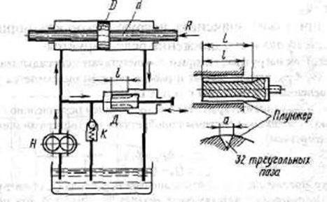 Система питается шестеренным насосом H, подача которого Qн = 120см3/с. Рабочая жидкость - минеральное масло плотностью р = 900кг/м3 и вязкостью 0,09 П. Для защиты системы от перегрузок на выходе из насоса установлен переливной клапан K, который открывается при давлении насоса P0 = 5 МПа. Для регулирования скорости и направления движения поршня, параллельно гидроцилиндру установлен дроссель Д. Он выполнен в виде переставного плунжера с продольными пазами треугольной формы. Число пазов i = 32, сторона треугольного сечения паза а = 0,5 мм, его длина L = 20 см.