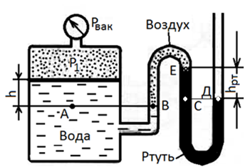 Определить абсолютное давление воздуха в баке р1, если при атмосферном давлении, соответствующем ha = 760 мм рт. ст., показание ртутного вакуумметра hрт = 0,2 м, высота h =1,5 м. Каково при этом показание пружинного вакуумметра? Плотность ртути р = 1