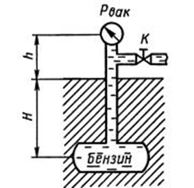 При перекрытом кране трубопровода К определить абсолютное давление в резервуаре, зарытом на глубине H = 5 м, если показание вакуумметра, установленного на высоте h=1.7 м, равно рвак = 0,02 МПа. Атмосферное давление соответствует hа = 740 мм рт. ст. Плотность бензина рб = 700 кг/м3