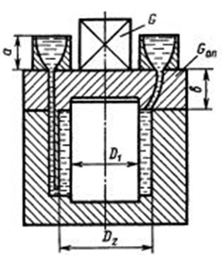 Определить минимальную силу тяжести груза G, который при заливке формы чугуном нужно положить на верхнюю опоку, чтобы предотвратить ее всплывание. Вес верхней опоки Gon = 650 H. Плотность жидкого чугуна р = 7000 кг/м3. Вес чугуна в литниках и выпорах не учитывать. Размеры: a=150 мм; 6=150 мм; D1 = 160 мм; D2 = 300 мм.