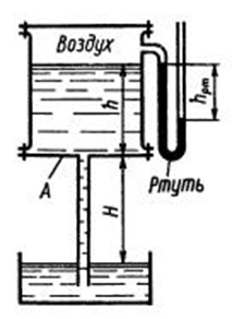 В сосуде А и в трубе вода находится в покое; показание ртутного прибора hрт = 295 мм. Определить высоту H, если h=1 м.