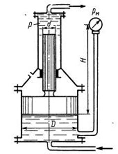 Определить давление р в верхнем цилиндре гидропреобразователя (мультипликатора), если показание манометра, присоединенного к нижнему цилиндру, равно Pм = 0,48 МПа. Поршни перемещаются вверх, причем сила трения составляет 10 % от силы давления жидкости на нижний поршень. Вес поршней G = 4 кН. Диаметры поршней: D = 400 мм, d=100 мм; высота H = 2,5 м; плотность масла р = 900 кг/м3.