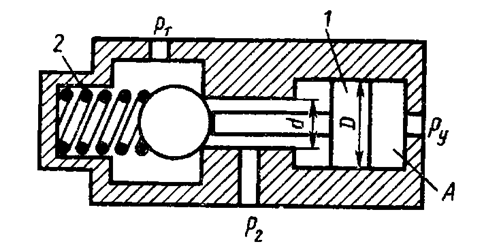 На рисунке представлена конструктивная схема гидрозамка, проходное сечение которого открывается при подаче в полость A управляющего потока жидкости с давлением ру. Определить, при каком минимальном значении ру толкатель поршня 1 сможет открыть шариковый клапан, если известно: предварительное усилие пружины 2 F = 50 Н; D = 25 мм, d=15 мм, P1 = 0,5 МПа, P2 = 0,2 МПа. Силами трения пренебречь.
