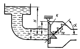 Определить, при какой высоте уровня воды начнет открываться клапан K, если сила пружины Fпр = 2 кН, угол ее установки а = 45°, высота h = 0,3 м. Труба перед клапаном имеет квадратное сечение со стороной а = 300 мм.