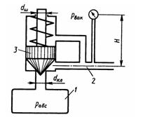 Определить абсолютное давление в резервуаре 1, если подача жидкости из него по трубопроводу 2 прекратилась и клапан 3 закрылся. Показание вакуумметра Рвак = 0,05 мПа, высота H = 2,5 м, сила пружины Fпр=10 Н, плотность жидкости р = 800 кг/м3, атмосферное давление соответствует hа = 755 мм рт. ст., диаметры dкл = 20 мм, dш=10 мм. Вертикальными размерами клапана 3 пренебречь.