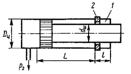 Для обеспечения обратного хода гидроцилиндра его полость 1 заполнена воздухом под начальным давлением P1. Найти размер l, определяющий положение стопорного кольца 2, которое ограничивает ход штока. Размеры цилиндра: Dц=150 мм; dш=130 мм; ход штока L= 400 мм. Сила трения поршня и штока 400 Н, давление слива Pсл = 0,3 МПа, давление воздуха в начале обратного хода р1mах = 2 МПа. Процесс расширения и сжатия воздуха принять изотермическим.