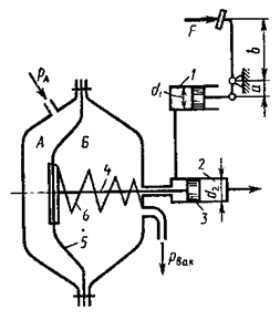 На рисунке показана принципиальная схема гидровакуумного усилителя гидропривода тормозов автомобиля. Давление жидкости, создаваемое в гидроцилиндре 1 благодаря нажатию на ножную педаль с силой Р, передается в левую полость тормозного гидроцилиндра 2. Помимо давления жидкости на поршень 3 в том же направлении действует сила вдоль штока 4, связанного с диафрагмой 5. Последняя отделяет полость A, сообщающуюся с атмосферой, от полости Б, где устанавливается вакуум благодаря соединению ее со всасывающим коллектором двигателя при нажатии на педаль. Пружина 6 при этом действует на диафрагму справа налево с силой Fпр. Определить давление жидкости, подаваемой из правой полости гидроцилиндра 2 к колесным тормозным цилиндрам. Принять: усилие педали F = 200 Н; сила пружины 6 Fпр = 20 Н; давление в полости Б Pвак = 0,06 МПа; диаметры: диафрагмы D=100 мм, гидроцилиндра 1 d1=25 мм и гидроцилиндра 2 d2 = 20 мм; отношение плеч Площадью сечения штока 4 пренебречь.