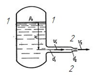 Из напорного бака вода течет по трубе диаметром d1=20 мм и затем вытекает в атмосферу через насадок (брандспойт) с диаметром выходного отверстия d2 = 10 мм. Избыточное давление воздуха в баке Pо = 0,18 МПа; высота H = 1,6 м. Пренебрегая потерями энергии, определить скорости течения воды в трубе v1 и на выходе из насадка v2.