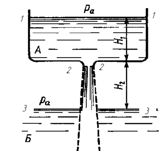 Для студентов МГТУ им. Н.Э.Баумана по предмету Механика жидкости и газа (МЖГ или Гидравлика)Жидкость должна перетекать из резервуара A, где поддерживается постоянный уровень Н1, в емкость Б. Для этой цели в дне резервуара устроено отверстие сЖидкость должна перетекать из резервуара A, где поддерживается постоянный уровень Н1, в емкость Б. Для этой цели в дне резервуара устроено отверстие с