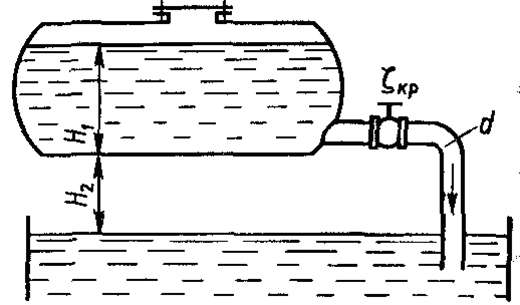 Бензин сливается из цистерны по трубе диаметром d = 50 мм, на которой установлен кран с коэффициентом сопротивления кр = 3. Определить расход бензина при Н1 = l,5 м и Н2 = 1,3 м, если в верхней части цистерны имеет место вакуум hвак = 73,5 мм рт. ст.