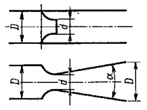 Сравнить коэффициенты сопротивления мерного сопла d, установленного в трубе D, и расходомера Вентури, состоящего из такого же сопла диаметром d, и диффузора. Коэффициенты сопротивления определить как отношение суммарной потери напора к скоростному напору в трубопроводе. Дано отношение диаметров D/d = 2. Принять коэффициенты сопротивлений: сопла ξ = 0,05; диффузора ξдиф = 0,15 (оба коэффициента относятся к скорости в узком сечении). Определить потери напора, вызываемые мерным соплом hс и расходомером hР, при одинаковой скорости потока в трубе v = 3 м/с.