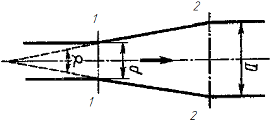 Определить потерю давления в диффузоре с начальным d=10 мм и конечным D= 20 мм диаметрами, если вязкость жидкости v=1 Ст; плотность р = 900 кг/м3; расход Q=1 л/с; угол диффузора а = 5. При решении задачи считать, что в любом сечении диффузора существ