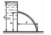 Задача 3.5. Из резервуара, установленного на полу и заполненного жидкостью до высоты H, происходит истечение жидкости через отверстие в стенке. На какой высоте у должно быть отверстие, чтобы расстояние х до места падения струи на пол было максимальным? Определить это расстояние. Жидкость считать идеальной.