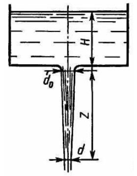 Задача 3.6. Жидкость вытекает через сопло диаметром d0, устроенное в горизонтальном дне сосуда. Найти связь между диаметром струи d и высотой z, если напор равен H. Сопротивлениями пренебречь.
