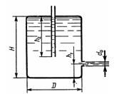 «Сосуд Мариотта» представляет собой плотно закрытый сосуд, в крышке которого укреплена трубка, сообщающая сосуд с атмосферой. Трубка может быть укреплена на различной высоте. В стенке сосуда имеется отверстие диаметром d0 = 10 мм, через которое происходит истечение в атмосферу. Какое давление установится в сосуде на уровне нижнего обреза трубки при истечении? Определить скорость истечения и время опорожнения «сосуда Мариотта» от верха до нижнего обреза трубки. Объемом жидкости в трубке и сопротивлением при истечении пренебречь (ε = 1). Форма сосуда цилиндрическая, D = 100 мм; H = 2 м, h1 = 0,2 м, h2 = 1 м.