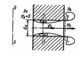 Через жиклер, представляющий собой отверстие диаметром d0 = 2 мм в стенке толщиной б = 5 мм, происходит истечение жидкости в полость, заполненную той же жидкостью при избыточном давлении P2=1 МПа. Определить давление по другую сторону стенки P0, при котором внутри жиклера возникает кавитация. Давление насыщенных паров жидкости соответствует hнп = 60 мм рт. ст., р = 850 кг/м3. Коэффициент сжатия струи внутри жиклера принять равным ε = 0,64; коэффициент расхода, равный коэффициенту скорости, μ = φ = 0,82. Какой будет расход Q при начале кавитации? Указание. Следует записать уравнение Бернулли для сечений 1-1 и 2-2, при этом учесть потерю напора на внезапное расширение по теореме Борда и использовать уравнение расхода.