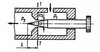 На рисунке изображена схема регулируемого игольчатого дросселя. Определить, на какое расстояние 1 необходимо вдвинуть иглу в дросселирующее отверстие для обеспечения перепада давления P = P1-P2 = 3 МПа, если угол иглы а = 30°, диаметр дросселирующего отверстия D = 6 мм, его коэффициент расхода м = 0,8, расход жидкости Q = 1,2 л/с, плотность рабочей жидкости р = 900 кг/м3. Указание. Площадь дросселирующего кольца определить по приближенной формуле S = S0 - SИ, где S0 - площадь отверстия, SИ - площадь иглы в сечении 1-1.