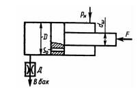 Жидкость с плотностью р = 850 кг/м3 подается от насоса в гидроцилиндр, а затем через отверстие в поршне площадью S0 = 5 мм2 и гидродроссель Д в бак (Рб = 0). 1) Определить, при какой площади проходного сечения дросселя Д поршень будет находиться в неподвижном равновесии под действием силы F = 3000 Н, если диаметр поршня D = 100 мм, диаметр штока dШ = 80 мм, коэффициент расхода отверстия в поршне μ0 = 0,8, коэффициент расхода дросселя μдр = 0,65, давление насоса Pн=1 МПа. 2) Определить площадь проходного сечения дросселя Д, при которой поршень будет перемещаться со скоростью vП=1 см/с вправо.