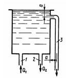 Вода по трубе 1 подается в открытый бак и вытекает по трубе 2. Во избежание переливания воды через край бака устроена вертикальная сливная труба 3 диаметром d = 50 мм. Определить необходимую длину L трубы 3 из условия, чтобы при Q = 10 л/с и перекрытой трубе 2 (Q2 = 0) вода не переливалась через край бака. Режим течения считать турбулентным. Принять следующие значения коэффициентов сопротивления: на входе в трубу ξ1=0,5; в колене ξ2 = 0,5; на трение по длине трубы λ = 0,03; а = 0.