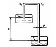 Труба, соединяющая два бака, заполнена жидкостью с вязкостью v = 0,01 Ст и плотностью р = 1000 кг/м3. Определить, при какой высоте Н жидкость будет двигаться из верхнего бака в нижний с расходом Q = 0,05 л/с, а при какой высоте Н будет двигаться в обратном направлении с тем же расходом, если длина трубы l = 2,5 м; ее диаметр d = 8 мм; коэффициент сопротивления каждого колена ξ = 0,5; избыточное давление в нижнем баке P0 = 7 кПа; вакуум в верхнем баке рвак = 3 кПа. Трубу считать гидравлически гладкой.