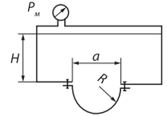 В дне призматического резервуара с бензином имеется прямоугольное отверстие a * b = 1 * 2 м, перекрытое полуцилиндрической крышкой радиусом R = 0,5 м. Определить усилие, воспринимаемое болтами крышки, если уровень бензина Н = 3,5 м, а давление паров бензина рм = 18 кПа.