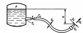 Определить давление в напорном баке р, необходимое для получения скорости истечения из брандепонта v2 = 20 м/с. Длина шланга l = 20 м; диаметр d1 = 20 мм; диаметр выходного отверстия брандспойта d2 = 10 мм. Высота уровня воды в баке над отверстием брандспойта H = 5 м. Учесть местные гидравлические сопротивления при входе в трубу ξ1 = 0,5; в кране ξ2 = 3,5; в брандспойте ξ = 0,1, который отнесен к скорости v2. Шланг считать гидравлически гладким. Вязкость воды v = 0,01 Ст.