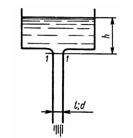 Из открытого резервуара жидкость вытекает в атмосферу по вертикальной трубе, имеющей закругленный вход. Требуется найти зависимость расхода Q и избыточного давления в начальном сечении 1-1 трубы от напора в баке высотой Н и длины трубы 1. Определить напор, при котором давление вдоль всей длины трубы l будет равно атмосферному и расход Q не будет зависеть от длины трубы. Построить пьезометрическую линию вдоль длины трубы, откладывая положительные избыточные давления вправо, а отрицательные - влево для двух значений напора h = 0,6 м и h = 2,5 м. Дано: длина трубы l = 3 м; диаметр d = 30 мм; коэффициент сопротивления трения λ = 0,03. Сопротивлением входа пренебречь.