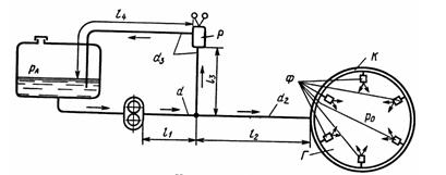 Автомобильный газотурбинный двигатель большой мощности удерживается на заданном режиме центробежным регулятором Р, который пропускает через себя в бак часть подачи насоса. Топливо с плотностью р = 800 кг/м3 подается в камеру сгорания Г, где давление Р0= 0,5 МПа через коллектор К (кольцевую трубу) и шесть форсунок Ф с отверстиями dф=1 мм и коэффициентами расхода μ = 0,25. Определить весовой расход топлива двигателем и мощность, потребляемую насосом, при следующих размерах труб: l1=4 м; l2 = 4 м; l3=1 м; l4 = 5 м; d1 = d2 = 5 мм; d3 = 4 мм. Принять режим течения турбулентным, а коэффициент Дарси лт = 0,04. Рабочий объем насоса V = 5 см3/об; частота вращения n = 8400 об/мин; полный к.п.д. насоса 0,80 при давлении P=1,2 МПа (n = 0,86). Центробежный регулятор рассматривать как дроссель с отверстием, площадь которого S=1 мм2; коэффициент расхода μ = 0,7.