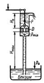 Определить максимальную высоту Hmах, на которую можно подсасывать бензин поршневым насосом, если давление его насыщенных паров составляет hнп = 200 мм рт. ст., а атмосферное давление ha = 700 мм рт. ст. Чему равна при этом сила вдоль штока, если Hо=1 м, рб = 700 кг/м3; D = 50 мм?