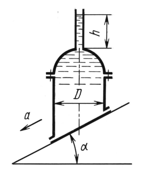 Определить горизонтальную и вертикальную силы давления на PВ полусферическую крышку цилиндрического сосуда диаметром 𝐷 = 0,6 м, скользящего с ускорением 𝑎 = 5 м/с2 по плоскости, наклоненной под углом 𝛼 = 60° к горизонту, если сосуд заполнен водой до уровня ℎ = 1 м в открытой трубке, присоединенной к верхней точке сосуда. Как изменятся эти силы, если сосуд остановится? ![]()