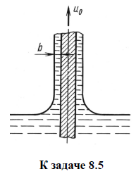 Задача (Куколевский И.И.) 8.5. В подшипнике с кольцевой смазкой слой жидкости подается из масляной ванны к трущимся поверхностям при помощи непрерывно движущегося ремня прямоугольного поперечного сечения. Определить толщину слоя подаваемой смазки и ее количество в секунду, если скорость движения ремня u0 = 0,2 м/с и его ширина равна B = 0,02 м. Динамическая вязкость жидкости μ = 1,5 П, плотность ρ = 900 кг/м3. Построить эпюру скоростей в слое.
