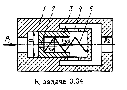Условие: На рисунке представлена конструктивная схема регулятора расхода (клапан, обеспечивающий постоянство расхода). Он состоит из корпуса 1 с дросселирующими отверстиями 4, подвижного плунжера 3 с дросселирующим отверстием 2 и пружины 5. Определить, при каком значении силы пружины Fпр регулятор будет обеспечивать расход Q = 5 л/мин, если диаметры D = 20 мм, d = 3 мм; коэффициенты расхода дросселирующих отверстий μ = 0,8; плотность рабочей жидкости ρ = 900 кг/м3. Считать, что в пределах рабочего хода плунжера сила пружины остается постоянной.
