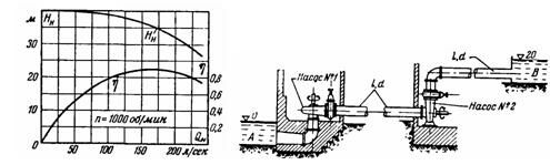 Задача (Куколевский И.И.) 14-25. Два последовательно соединенных одинаковых центробежных насоса перекачивают воду при n1 = n2 =1000 об/мин из водохранилища А с отметкой Δ0 в бассейн В, с отметкой уровня Δ20 по трубопроводу, состоящему из двух одинаковых участков длиной l=1 км и диаметром d= 250 мм каждый (λ = 0,02).