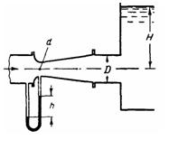 Задача (Куколевский И.И.) 7-10 В трубопроводе диаметром D = 50 мм, подающем воду в бак с постоянным уровнем H=1,5 м, установлена труба Вентури с горловиной диаметром d = 25 мм. Коэффициент сопротивления сходящегося участка расходомера ? = 0,06, коэффициент потерь в его диффузоре ?Д = 0,20. Какой наибольший расход можно подавать в бак до появления кавитации в расходомере, если упругость паров воды Рнп = 19,6 кПа (t = 60°С). Каково будет при этом расходе показание h ртутного дифференциального манометра? Атмосферное давление 98 кПа