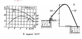 Задача (Куколевский И.И.) 14-17 При помощи центробежного насоса, характеристика которого задана при n = 2900 об/мин, необходимо перекачивать воду по сифонному трубопроводу с одинаковыми восходящей и нисходящей ветвями, каждая длиной l = 10 м и диаметром d = 40 мм (? = 0,03). Разность уровней в баках а = 2 м, верхняя точка К сифона расположена на высоте b = 8 м.