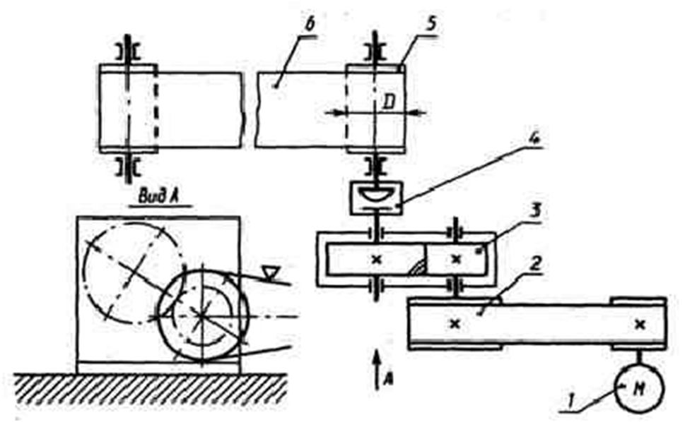 Привод к ленточному конвейеру (рис. 1) состоит из: 1 – двигатель; 2 – клиноременная передача; 3 – цилиндрический редуктор; 4 – цепная муфта; 5 – барабан; 6 – лента конвейера.
