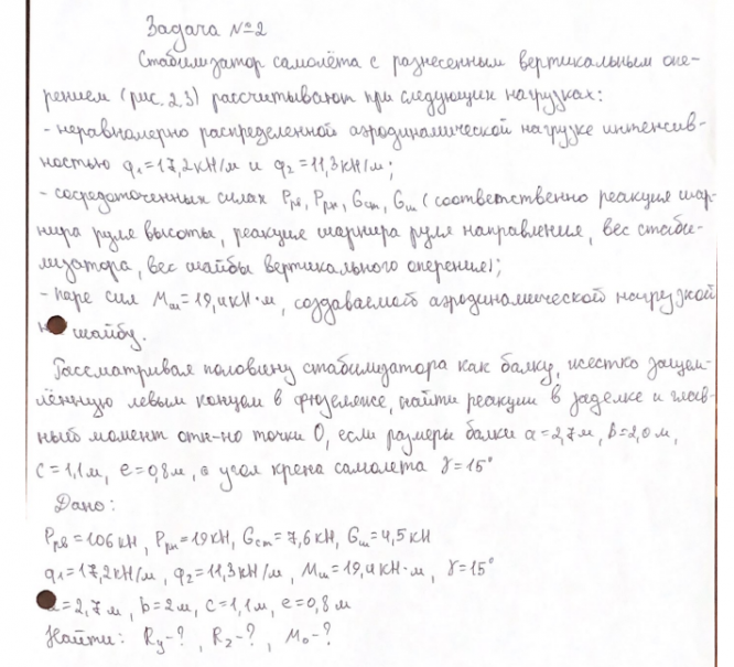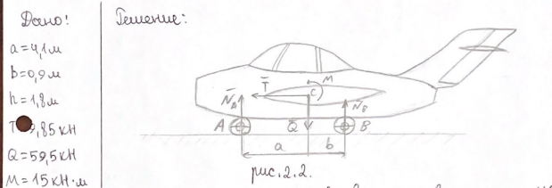 Перед разбегом самолёта при взлёте два задних колеса шасси заторможены, поэтому при работающих двигателях самолёт находится в равновесии (рис. 2.2). Приведя силу тяги двигателя к центру тяжести самолёта, получаем в точке С горизонтальную силу Т, вертикальную силу Q и пару сил с моментом М. Определить вертикальные составляющие давления на переднее и каждое из 2-х задних колёс для этого случая, если в момент старта точка С расположена на высоте h по вертикали, отстоящей на расстоянии а от оси переднего колеса и на расстоянии в от задних колёс самолёта.