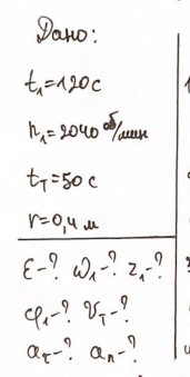 Вращение ротора авиационного двигателя, воздушного винта самолёта, винта вертолёта (несущего или рулевого) при запуске двигателя характеризуется угловым ускорением и временем выхода на режим малого газа. К моменту t ротор-винт имеет угловую скорость, частоту вращения, угол поворота и совершает оборотов. Точка, лежащая на радиусе, в какой-то момент t имеет скорость, касательное ускорение и нормальное ускорение. Принимая вращение ротора (винта) равнопеременным, определить по заданным в таблице параметрам.