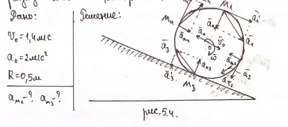 Задача № 2. Колесо катится без скольжения в вертикальной плоскости по наклонному прямолинейному пути. Найти ускорение концов двух взаимоперпендикулярных диаметров колеса, на которых один параллелен рельсу, если в рассматриваемый момент времени скорость центра колеса, ускорение центра колеса, радиус колеса.