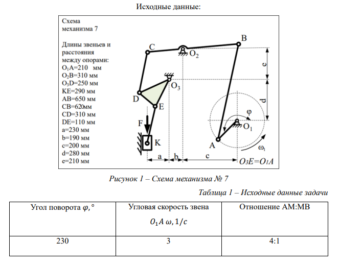 Вычертить механизм с учетом масштабного коэффициента, по заданным параметрам, приведенным со схемой механизма. Для вычерченного механизма определить: 1. Названия звеньев, количество кинематических пар и групп Ассура. 2. Линейные скорости всех точек механизма и угловые скорости звеньев методом планов. 3. Линейные ускорения точек механизма и угловые ускорения звеньев методом планов. 4. Ускорение точки М, располагающейся на звене АВ