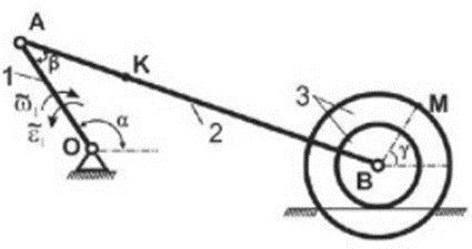 Дано: ω1=1 с–1, ε1= 2 с–2, ОА = 30 см, АВ = 60 см, АК = 20 см, R = 15 см, r = 10 см, α = 120°, β = 30°, γ = 45°.