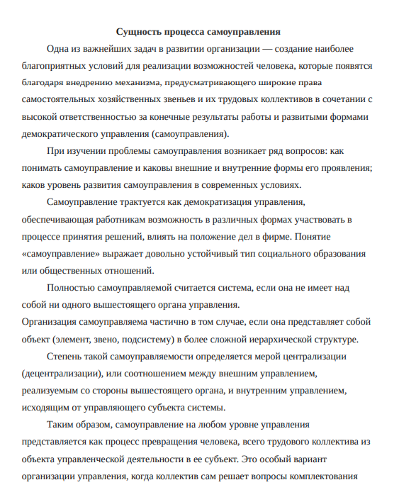 В то же время в экономически развитых странах, а также странах с переходной экономикой стали реальностью новые технологии управления, объединяющие интересы собственников, менеджмента и наемных работников, реализуемые на базе развития различных форм самоуправления. Происходят трансформации и в самом менеджменте, где на смену традиционным иерархическим структурам приходят структуры горизонтального типа, ряд функций управления которыми реализуются самоуправляемыми бригадами и группами на первичном производственном уровне. Цель реферата – рассмотреть необходимость самоуправления в организации и изучить, для чего оно необходимо. Задачи реферата: 1. Рассмотреть сущность процесса самоуправления. 2. Рассмотреть роль самоуправления в деятельности организации. 3. Подчеркнуть необходимость самоуправления для организации.