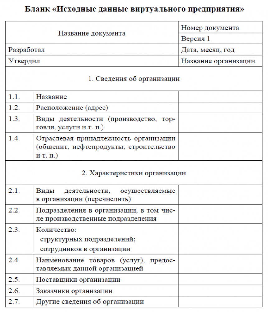 Подгруппа студентов на первом этапе должна сформировать виртуальное предприятие, для которого необходимо определить: