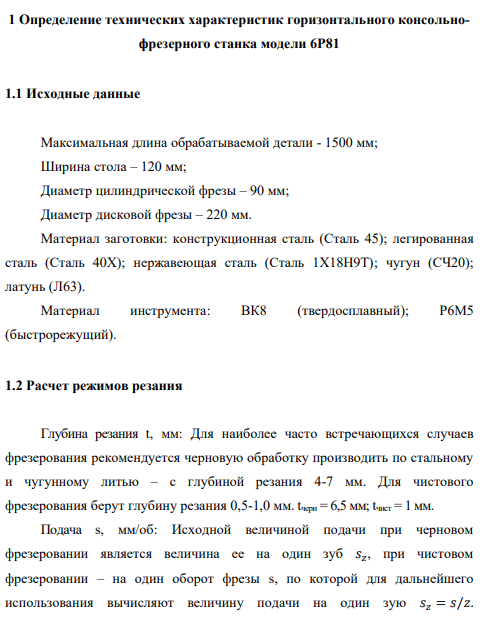 1 Исходные данные Максимальная длина обрабатываемой детали - 1500 мм; Ширина стола – 120 мм; Диаметр цилиндрической фрезы – 90 мм; Диаметр дисковой фрезы – 220 мм. Материал заготовки: конструкционная сталь (Сталь 45); легированная сталь (Сталь 40Х); нержавеющая сталь (Сталь 1Х18Н9Т); чугун (СЧ20); латунь (Л63). Материал инструмента: ВК8 (твердосплавный); Р6М5 (быстрорежущий).