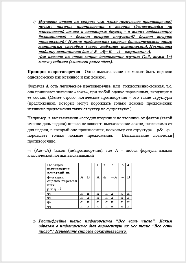 1. Изучаете ответ на вопрос: чем плохо логическое противоречие? почему наличие противоречия в теории (базирующейся на классической логике и некоторых других, - а таких подавляющее большинство) - делает теорию ненужной? делает теорию тривиальной? Нужно представить строгое доказательство этого матричным способом (через таблицы истинности). Построить таблицу истинности для A & Ø A|= B. Ø A – отрицание А . a. Для ответа на этот вопрос достаточно изучит Гл.3, темы 1-4 моего учебника (выложен ранее здесь). 2. Расшифруйте тезис пифагореизма \"Все есть число\". Каким образом в пифагореизме был опровергнут их же тезис \"Все есть число\"? Приведите строгое доказательство.