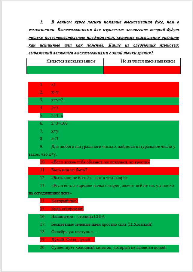 Несмотря на прискорбное состояние, в котором он находился, произнося выше упомянутое рассуждение (его содержание история не сохранила), вполне можно поставить вопрос о логической корректности последнего. Итак: является ли рассуждение, в котором и посылки, и заключение логически ложны, логически корректным? Логически некорректным? Или предоставленной информации не хватает для того, чтобы решить этот вопрос? в) + Пусть в одношаговом рассуждении все посылки фактически истинны, а заключение фактически ложно. Можно ли что-то сказать о его логической правильности или информации не достаточно? г) Пусть о рассуждении известно только то, что и его посылки, и заключение фактически истинны.